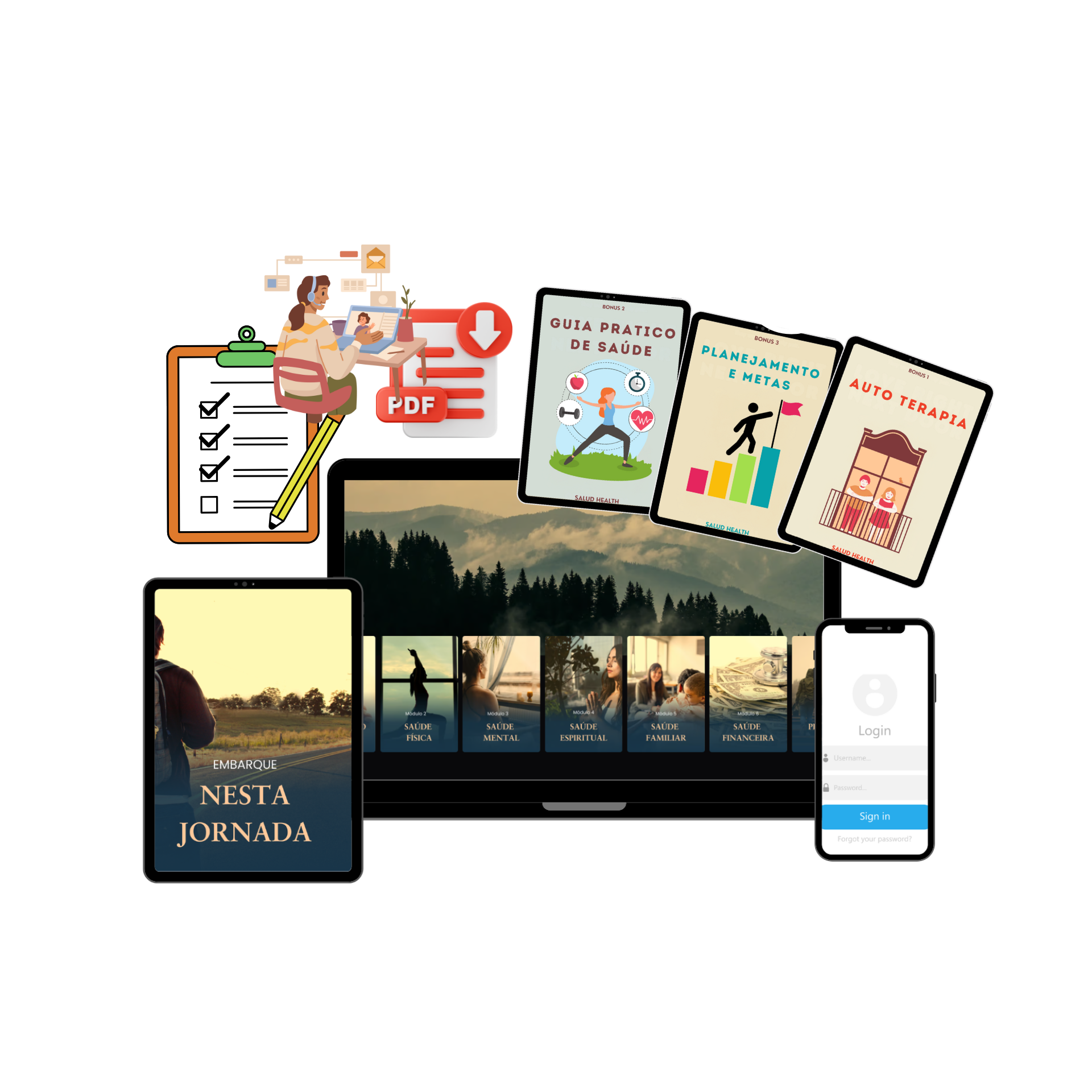 Ebooks, guias, checklists, templates, exercícios práticos.